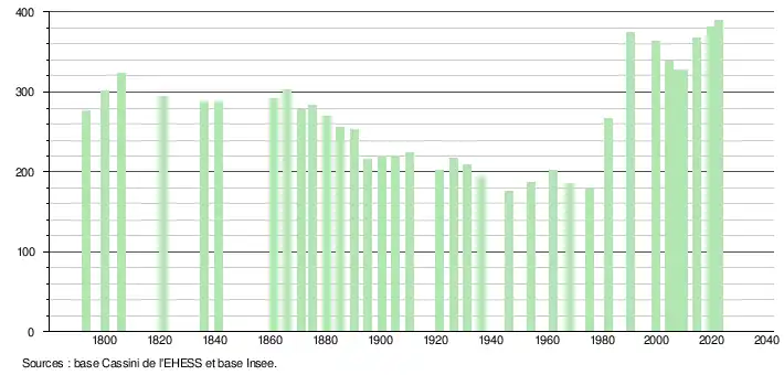 L'évolution du nombre d'habitants est connue à travers les recensements de la population effectués dans la commune depuis 1793. Pour les communes de moins de 10 000 habitants, une enquête de recensement portant sur toute la population est réalisée tous les cinq ans, les populations de référence des années intermédiaires étant quant à elles estimées par interpolation ou extrapolation[16]. Pour la commune, le premier recensement exhaustif entrant dans le cadre du nouveau dispositif a été réalisé en 2004[17].