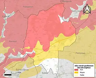 Les mouvements de terrains susceptibles de se produire sur la commune sont des mouvements de terrains, notamment des tassements différentiels[16]. Le retrait-gonflement des sols argileux est susceptible d'engendrer des dommages importants aux bâtiments en cas d’alternance de périodes de sécheresse et de pluie[17]. 88,7 % de la superficie communale est en aléa moyen ou fort (54,9 % au niveau départemental et 48,5 % au niveau national)[Carte 2]. Depuis le , en application de la loi ELAN, différentes contraintes s'imposent aux vendeurs, maîtres d'ouvrages ou constructeurs de biens situés dans une zone classée en aléa moyen ou fort[Note 1],[18].
