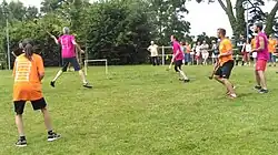 - L'autre équipe l'en empêche et tente de récupérer la balle. Les placages ne sont pas permis. Le joueur bloqué avec la balle doit s'en débarrasser dans les 3 secondes. Les passes en avant sont autorisées et même nécessaires, notamment sur les longues distances, grâce à une anse en corde cousue dans la choule. On peut également bloquer un joueur sans la balle.