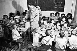 Le programme a été initié par l’OSE en 1948 et a été testé en priorité sur la SP[48], il consistait à donner aux enfants en plus du déjeuner, un ‘goûter’ composé de pain avec de la confiture et une boisson nourrissante[18]. En 1949, le coût du goûter pour l’OSE était de 20 francs par enfant[49].