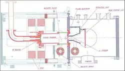 L'enceinte, au centre, est une chambre entourée de deux bobines cylindriques permettant de créer un champ magnétique. Par ailleurs, un blindage magnétique est installé au contact des bobines afin de réduire la présence du champ dans la zone d’extraction des ions (H−).