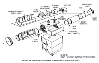Chaque module GPHS se présente sous forme d'un parallélépipède rectangle empilable de 9,948 × 9,32 × 5,82 cm pesant 1,44 kg et fournissant une puissance thermique nominale de 250 W au début de la mission par désintégration radioactive d'un radioisotope, le plutonium 238, sous forme de dioxyde de plutonium 238PuO2 des quatre éléments chauffants à radioisotope (RHU en anglais) composant chaque module GPHS.
