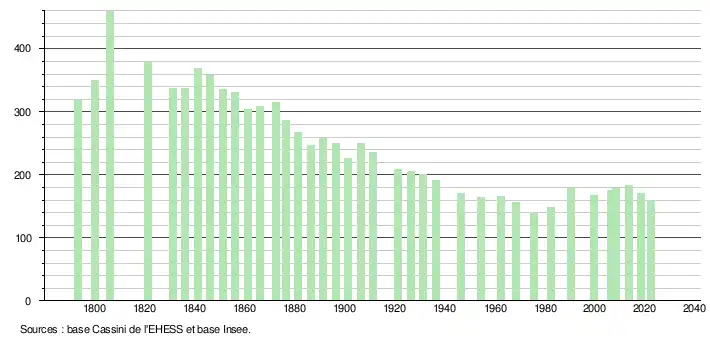 L'évolution du nombre d'habitants est connue à travers les recensements de la population effectués dans la commune depuis 1793. Pour les communes de moins de 10 000 habitants, une enquête de recensement portant sur toute la population est réalisée tous les cinq ans, les populations de référence des années intermédiaires étant quant à elles estimées par interpolation ou extrapolation[15]. Pour la commune, le premier recensement exhaustif entrant dans le cadre du nouveau dispositif a été réalisé en 2008[16].