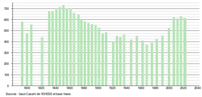 L'évolution du nombre d'habitants est connue à travers les recensements de la population effectués dans la commune depuis 1793. Pour les communes de moins de 10 000 habitants, une enquête de recensement portant sur toute la population est réalisée tous les cinq ans, les populations de référence des années intermédiaires étant quant à elles estimées par interpolation ou extrapolation[20]. Pour la commune, le premier recensement exhaustif entrant dans le cadre du nouveau dispositif a été réalisé en 2006[21].