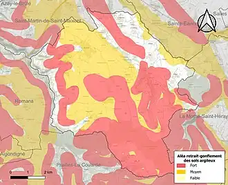 Les mouvements de terrains susceptibles de se produire sur la commune sont des tassements différentiels[17]. Le retrait-gonflement des sols argileux est susceptible d'engendrer des dommages importants aux bâtiments en cas d’alternance de périodes de sécheresse et de pluie[18]. 81,7 % de la superficie communale est en aléa moyen ou fort (54,9 % au niveau départemental et 48,5 % au niveau national)[Carte 2]. Depuis le , en application de la loi ELAN, différentes contraintes s'imposent aux vendeurs, maîtres d'ouvrages ou constructeurs de biens situés dans une zone classée en aléa moyen ou fort[Note 2],[19].