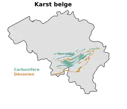 Le karst belge se situe dans la partie sud du pays, en Wallonie. Il est composé de calcaires du Dévonien moyen (grottes de Han, grottes de Hotton, grotte de Rochefort, grottes de Remouchamps) et du Dinantien. À cause du manque de relief et de la nature tourmentée du sous-sol (plissement hercynien) entaillé par les cours d'eau (Meuse, Lesse, Ourthe, Amblève et Vesdre), le développement des cavités belges est limité. La plus profonde atteint 140 mètres, le trou Bernard (y compris la zone noyée) et la plus longue, un peu plus de 10 kilomètres, les grottes de Han à Han-sur-Lesse dans le massif de Boine.