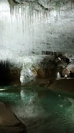 - ↑ Voiles polycristallins, appelés aussi pendeloques, résultant d'un ruissellement continu (et non d'un goutte à goutte) très lent grâce à la tension superficielle. Parfois, sont observées par transparence des couches de croissance successives apparaissant de manière cyclique en fonction des conditions climatiques qui régnaient en surface.