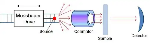 Dans sa forme la plus commune, la spectroscopie Mössbauer est une spectroscopie d'absorption : un échantillon solide est exposé à un faisceau de rayons gamma, et un détecteur mesure l'intensité transmise à travers l'échantillon. Les atomes de la source émettrice doivent être du même isotope que dans l'échantillon.