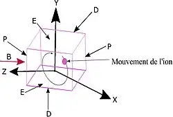 Les ions sont piégés dans la cellule ICR par un champ magnétique. Un ion, sous l’action d’un champ magnétique uniforme, subit une force de Lorentz qui entraîne un mouvement circulaire perpendiculaire au champ. Il en résulte une force centripète.