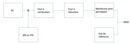 Lorsque les échantillons ont besoin d’être séparés préalablement, il est plus efficace d’utiliser la chromatographie gazeuse (GC) pour les échantillons volatils. Les produits provenant de la colonne GC sont transportés vers une chambre de combustion. Par contre, il est aussi possible d’envoyer des composés vers un spectromètre de masse externe ou un détecteur à ionisation de flamme. Ensuite, cette chambre est majoritairement constituée d’un tube d’aluminium contenant du cuivre, du nickel et du platine. Les composés sont brûlés à très haute température et produisent une combinaison de CO2, NOx et H2O. Comme en analyse élémentaire, l’échantillon est transporté dans une chambre de réduction où les protoxyde d'azoteoxydes nitreux sont convertis en N2 et l’excès de O2 est retiré. De plus, l’eau est retirée à l’aide d’une trappe chimique et d’hélium. Par la suite, l’échantillon est introduit dans la source d’ions de l’IRMS à un débit très stable d’approximativement 0,5 mL/min.