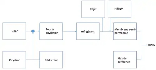La chromatographie liquide (LC) couplée à de la spectrométrie de masse à rapport isotopique est typiquement destinée à l’analyse du carbone. Lorsque la solution quitte la colonne, elle est dirigée vers une interface d’oxydation destinée aux produits chimiques humides[2]. En effet cette méthode convertit les produits organiques en produit gazeux du CO2. Par contre, il faut prendre des précautions supplémentaires pour réduire les interférences. Par exemple, il faut s’assurer que la phase mobile ne contient pas de composés oxydables qui pourraient influencer les résultats. Pour ce faire, l’éluant est mélangé à un agent oxydant comme du persulfate d'ammonium et un catalyseur comme de l’acide phosphorique avec du nitrate d’argent[2]. Le tout est alors oxydé dans un réacteur à capillaire où les produits organiques sont convertis en CO2. Une membrane échangeuse séparera les différents gaz (vapeur d’eau, oxygène, argon, etc.) et le tout sera transféré au travers d’une membrane perméable aux gaz à l’aide d’hélium à contre-courant. Le CO2 contenu dans l’hélium est alors séché et est transmis à l’appareil via un open split. La détermination du rapport isotopique 13C/12C d’un échantillon peut donc être faite avec une méthode de très haute précision.