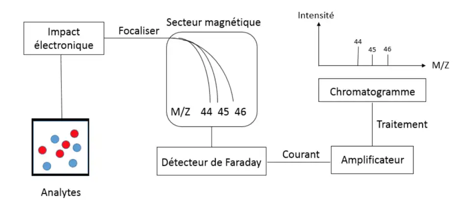 Dans cette technique d’analyse, l'analyseur est de type spectromètre de masse. Les analytes sont d’abord ionisés par impact électronique. Des électrons de haute énergie, soit de 70 eV, collisionnent avec les différents gaz. L'ionisation par nébulisation n'est pas assez énergétique pour ioniser les gaz, car ces molécules stables possèdent des liens forts. Cet impact les ionise selon la réaction suivante : A(g)+ e− → A+(g)+ 2e− , où A représente le gaz analysé. Les ions quittent la source et ils sont focalisés et accélérés sous une différence de potentiel. Ils passent ensuite dans un champ magnétique (secteur magnétique), séparant ainsi les différents ions selon leur masse et leur charge, avant de frapper les détecteurs de Faraday. Ce type de détecteur est formé d'un métal conducteur. Lorsqu’un ion frappe ce dernier, un courant est produit. Le courant induit dépend également du nombre d'ions interceptés. Le courant généré par ses détecteurs est ensuite amplifié et analysé en fonction du temps par le système de données IRMS. Ce dernier trace un chromatogramme pour les ions spécifiques d’un rapport m/z. L’aire sous la courbe est proportionnelle au nombre d’électrons détecté. Comme mentionné auparavant, un analyseur de masse de type quadripôle, temps de vol ou piège à ions quadripolaire ne possèdent pas la précision et la sensibilité pour détecter les différences subtiles entre les abondances des isotopes[4].