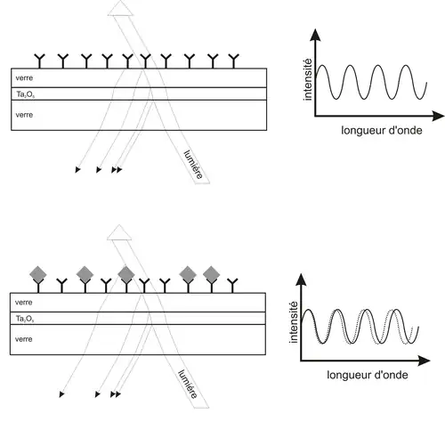 Un changement dans l’épaisseur optique de la couche induit une modulation du spectre d’interférence. L’observation temporelle de ces modulations permet d’étudier les changements dans les liaisons des molécules cibles.