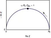 Le graphe de Nyquist des électrochimistes qui portent la partie imaginaire changée de signe de l'impédance en fonction de sa partie réelle est, dans un repère orthonormé, un demi-cercle de diamètre et de pulsation au sommet égale à (Fig. 3). D'autres représentations des impédances, représentation de Bode, de Black, etc., sont utilisables[2].