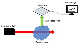 La spectroscopie par photodissociation infrarouge (IRPD) est une spectroscopie utilisant le rayonnement infrarouge pour rompre les liaisons dans les molécules, souvent ioniques (photodissociation), dans un spectromètre de masse[1]. En combinaison avec la post-ionisation, cette technique peut également être utilisée pour les espèces neutres. Il a été démontré que la spectroscopie IRPD utilise l'ionisation électronique, l'effet de couronne et l'ionisation par électronébuliseur pour obtenir des spectres de composés volatils et non volatils[2],[3]. Les gaz ionisés piégés dans un spectromètre de masse peuvent être analysés sans la nécessité d'un solvant comme dans la spectroscopie infrarouge[4].