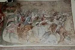 - Bataille de Sant'Elfisio contre les infidèles, 1390-1392, Camposanto, Pise. Spinello Aretino réduit le groupe des « soldats avec lances » dans la partie gauche, outil plastique du Trecento, au rôle d'élément secondaire dans une composition complexe : il constitue le point de départ du mouvement qui balaie le reste de l'image de gauche à droite, enrichissant le vocabulaire plastique des scènes militaires. La bataille est conçue comme un peloton compact, dans lequel les recherches postérieures introduiront une structure plus clairement différenciée. Un ange ailé combat à côté du saint et leurs épées sont parallèles ; cette intimité du combattant et du divin disparaitra par la suite. Spinello peint ici une bataille concrète, mais où les hommes n'ont pas encore défini leur « nationalité » propre, ce qui sera fait au siècle suivant[3].