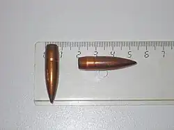 Une nouvelle balle aérodynamique Spitzgeschoß, attribuée au balisticien indépendant Arthur Gleinich, a été testée en 1902 et officiellement adoptée le 3 avril 1903. Après plusieurs révisions de forme, il est entré en production de masse en 1904. Le nez du Spitzgeschoß était pointu à l'extérieur comme le design français et sa forme était brevetée, mais la veste entièrement métallique du Spitzgeschoß différait en interne[6],[7],[8]. Le programme Gewehr-Prüfungskommission a abouti à la cartouche S Patrone ou 7,92 × 57 mm Mauser, qui était d'un poids de 9,9g et avec la balle spitzer d'un diamètre légèrement augmenté de 8,2 mm (0,32283464534 po) qui avait un coefficient balistique (G1 BC) d'environ 0,321 à 0,337 (les coefficients balistiques sont quelque peu discutables), ainsi qu'un chambrage et un alésage dimensionnellement repensés (désignés comme "alésage S") et une nouvelle poudre sans fumée (à base de nitrocellulose et nitroglycérine ), qui a permis d'améliorer considérablement la vitesse initiale de 878m/s à partir d'un canon de 740mm. Le S Patrone a été adopté par l'armée et la marine allemandes en 1903 et avait une portée terminale maximale d'environ 3 700 m (4 050 yd)[9]. La combinaison d'une vitesse initiale accrue et d'une aérodynamique améliorée des balles a fourni une trajectoire de balle beaucoup plus plate, ce qui a augmenté la probabilité de toucher une cible individuelle à la plupart des distances de combat typiques.