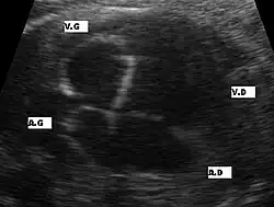 Plusieurs aspects peuvent se rencontrer: une hypertrophie ou une hypoplasie du ventricule gauche ou un ventricule gauche quasiment sans aucune contraction sans aucun flux sanguin au doppler. La circulation du sang étant alors uniquement assuré par le ventricule droit. Le pronostic de cette maladie dépendra du ventricule droit. La visualisation directe d'une ouverture incomplète de la valve aortique et la présence de turbulence au niveau aortique par doppler couleur sont les deux signes directes de cette pathologie mais difficiles à visualiser lors de l'échographie obstétricale. Une brillance anormale du ventricule gauche est un signe de souffrance myocardique par diminution du flux sanguin des coronaires.
