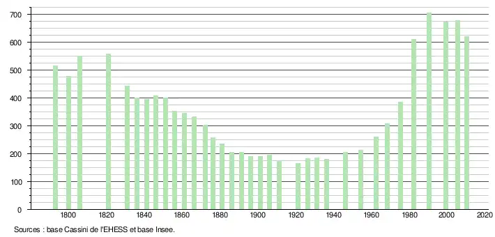 - ↑ Dans le tableau des recensements et le graphique, par convention dans Wikipédia, le principe a été retenu, pour les populations légales postérieures à 1999 de n’afficher dans le tableau des recensements et le graphique que les populations correspondant à l'année 2006, première population légale publiée calculée conformément aux concepts définis dans le décret no 2003-485 du 5 juin 2003, et les années correspondant à une enquête exhaustive de recensement pour les communes de moins de 10 000 habitants, ainsi que la dernière population légale publiée par l’Insee.