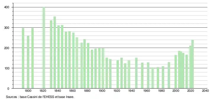L'évolution du nombre d'habitants est connue à travers les recensements de la population effectués dans la commune depuis 1793. Pour les communes de moins de 10 000 habitants, une enquête de recensement portant sur toute la population est réalisée tous les cinq ans, les populations de référence des années intermédiaires étant quant à elles estimées par interpolation ou extrapolation[23]. Pour la commune, le premier recensement exhaustif entrant dans le cadre du nouveau dispositif a été réalisé en 2004[24].