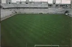 Alors que le site n'est encore qu'un terrain vague, la première phase des travaux consiste à creuser un trou de 120 mètres par 80 mètres destiné à recevoir la pelouse, qui est plantée bien avant le début de la construction des tribunes[13]. 150 000 mètres cubes de terre sont excavés[14] et les travaux de terrassement sont terminés à la fin du mois de .