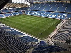 Mais la nouvelle conception majeure concerne le toit, membrane blanche qui recouvre toutes les tribunes, et qui est même modulable au-dessus de la tribune sud, pour pouvoir assurer un éclairage adéquat de la pelouse sur cette partie du stade. Les travaux sur les tribunes ouest et est commencent en octobre 2008, et s'achèvent en septembre 2010. Sur l'ensemble des gradins, de nouveaux sièges sont installés par la société Grupa Nowy Styl[10]. Entre temps, le , le stade accueille pour la première fois le Warta Poznań, l'autre club de la municipalité qui a délaissé l'Ogródek et qui affronte le Bruk-Bet Nieciecza en deuxième division[11].