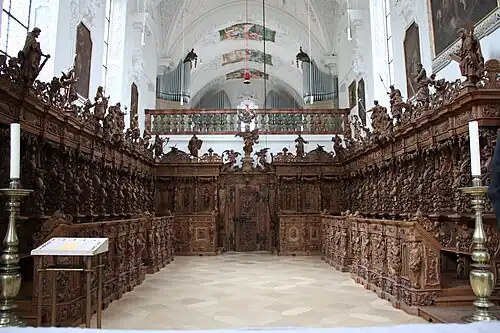 Restauration. Une première étape, de 1981 à 1986, consiste à décaper précautionneusement les boiseries pour supprimer le vernis noir qui les recouvrait intégralement. Puis les travaux doivent être suspendus en raison de la restauration de l’église. Dès 1992 débute la reconstruction sur place de ce chef-d’œuvre de mobilier baroque, opération pour laquelle on ne dispose que des photos des années 1880. Il faut en outre reconstituer plus de parties que ce que l’on avait initialement prévu. Par exemple, de 25 pupitres, seuls 21 avaient survécu. Les stalles restaurées ont été bénies le .