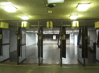 « Cabines ou stalles de tir » ; elles équipent certains stands de tir, fournissant aux tireurs (debout ou allongés) une zone de tir clairement délimitées. Elles réduisent les risques de tirs ratés ou de cartouches éjectées vers d'autres tireurs. Les cloisons ou de panneaux de ces cabines peuvent être traitées acoustiquement pour réduire le niveau sonore de la zone de tir. Parfois elles sont en verre blindé, ce qui permet à l'instructeur d'observer le comportement des tireurs[9]. Elles peuvent être équipées de moyens de communication et/ou d'exploitation de cibles (commandes d'éclairage de cible ou de cabine, visualisation à distance) ainsi que d'étagères pour les armes et leurs munitions. En cas de mauvaise ventilation, le tireur y risque plus d'inhaler des vapeurs et fumées de tir toxiques.