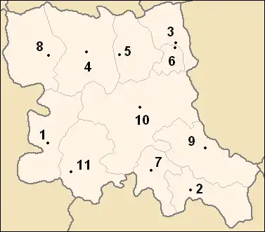 Les noms de localités en caractères gras ont le statut de ville (en bulgare : град, translittéré en grad). Les autres localités ont le statut de village (en bulgare : село translittéré en selo).