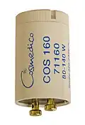 - Le « starter » est un dipôle électrique qui se comporte comme un interrupteur. Au départ, il n'est pas conducteur. Il devient conducteur pendant une courte durée, lorsqu'on lui applique une tension supérieure à une tension v1 (c'est le cas lorsqu'on le branche au secteur). Il est isolant lorsqu'on lui applique une tension inférieure à une tension v0 (c'est le cas lorsqu'un courant traverse le ballast avec lequel il est monté en série). Pour obtenir cet effet, le « starter » contient un gaz, qui à la tension v1 s'ionise et laisse passer un très faible courant. Cette ionisation réchauffe un bilame qui finit par se fermer, rendant le « starter » conducteur. Une fois le bilame fermé, le gaz cesse d'être ionisé et le bilame finit par se rouvrir en refroidissant. En dessous de v0, la tension n'est pas suffisante pour ioniser le gaz. Il existe aussi des starters électroniques [1]. Ceux-ci utilisent une séquence différente d’allumage qui peut permettre de prolonger la vie de la lampe et d'éviter le noircissement des extrémités. Ils limitent le redémarrage du cycle d'allumage sans fin pour éviter les phénomènes de clignotement en fin de vie de la lampe.