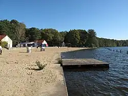 Plage avec un ponton vers l'eau.