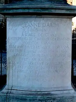 « Jeanne d'Arc (1412-1431) à l'âge de dix-sept ans entreprend de chasser les ennemis hors de France. Elle fait lever le siège d'Orléans, détruit l'armée anglaise à Patay, conduit Charles VII à Reims et le fait sacrer roi. Blessée en voulant délivrer Paris, elle est prise devant Compiègne et brûlée vive par les Anglais à Rouen. Elle avait dix-neuf ans. »