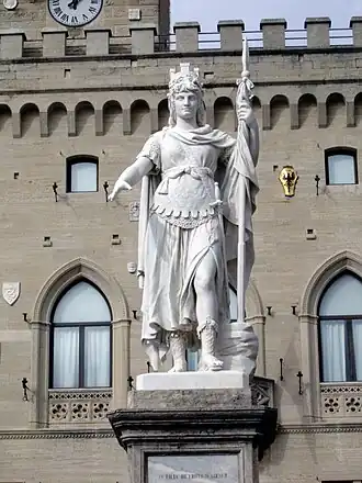 La statue symbolise le rétablissement de liberté, représentée comme une guerrière avançant farouchement avec une main tendue vers l'avant et l'autre avec un drapeau ; sur la tête de la statue se trouve une couronne à trois tours représentant la ville fortifiée de Saint-Marin.