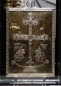Au centre du couvercle se trouvent neuf plaques d’émaux, entourées d’une bande décorative. La rangée centrale des images est une déesis : au centre est un christ trônant (Christ pantocrator), à gauche Jean l'Évangéliste accompagné de l'archange Gabriel, à droite Marie accompagnée de l'archange Michel. Les anges portent des habits de la cour byzantine, Marie et Jean sont vêtus de pourpre impériale. Dans les rangées au-dessus et en dessous, des saints par paires. Les registres du haut et du bas présentent les douze apôtres, groupés par deux. Les plaques centrales sont entourées d'un bandeau ornemental constellé de pierres où sont enchâssés des médaillons de huit saints en buste. Deux plaques décorées de trois rosettes figurées par des petits grenats et constellées de pierres se trouvent au-dessus et en dessous de ce cadre. Le tout est entouré de dix bandes rectangulaires[3]. Le dos du couvercle montre une croix posée sur un socle, en argent doré repoussé. Au pied de l'arbre pousse une acanthe.