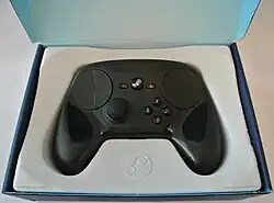 Lancée en novembre 2015[44], la manette comprend deux trackpads haute résolution, remplaçant les traditionnels sticks analogiques des manettes de consoles actuelles. La manette possède également pas moins de 17 boutons, dont 11 en face : 3 en bas correspondant à Start, Select et Espace, 4 au-dessus en forme de carré et 4 autres aux coins de ces carrés. Sur le sommet, deux boutons de tranche correspondant à LB et RB, et deux gâchettes arrières ressemblant à LT et RT. Autres nouveautés par rapport aux contrôleurs concurrents, la manette propose deux touches longilignes et verticales sur l'arrière des poignées pour accueillir l'annulaire et l'auriculaire. De plus, elle est embarque des capteurs gyroscopique et accéléromètre. Chris Kohler du magazine Wired a pu tester le Steam Controller en jouant à Civilization V lors d'un événement presse chez Valve, et note que lorsqu'il utilise le pavé tactile pour déplacer le curseur de la souris, les électro-aimants de la manette créent un retour audio et tactile comme s'il utilisait un trackball[45]. Bien que la manette soit conçue spécifiquement pour les Steam Machine, elle peut également être utilisée avec Steam sur des PC existants[46].