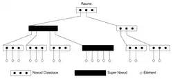 Ces super-nœuds sont semblables aux nœuds classiques d'un R-Tree, cependant la différence se situe sur le nombre maximal d'éléments pouvant être contenus. Ce nombre est supérieur à celui des nœuds classiques.
