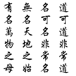Voici les cinq premiers caractères de la première colonne (en partant de la droite) de l'illustration ci-contre, une œuvre du calligraphe, poète et graveur de sceaux 山杉 Shānshān, en caractères actuels, à titre de comparaison : 松下問童子 sōng xià wèn tóng zǐ, extrait d'un poème de 賈島 Jia Dao, poète 唐 Táng :「尋隱者不遇」 Xún yǐn zhě bú yù (« À la recherche d’un ermite, sans le rencontrer »).