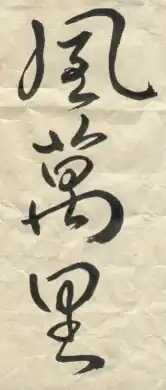 - ↑ Cette calligraphie est un extrait du 九歌 (Jiǔ Gē, Neuf Chants) de 屈原 Qū Yuán (339 ?-278 avant l'ère chrétienne) dont voici le texte en caractères réguliers (la calligraphie se lit bien sûr en colonnes de droite à gauche) : 帝子降兮北渚, 目眇眇兮愁予. 袅袅兮秋風, 洞庭波兮木葉下 (Dì zǐ jiàng xī běi zhǔ, mù miǎo miǎo xī chóu yú. Niǎo Niǎo xī qiū fēng, dòng tíng bō xī mù yè xià). On remarque que, parmi les contraintes sténographiques (feintes), l'auteur a utilisé le caractère d'itération, 々, servant à ne pas répéter les caractères redoublés : on lit en effet 眇々 dans la deuxième colonne (en partant de la droite) et 袅々, en haut de la troisième colonne, au lieu de 眇眇 et 袅袅.