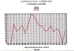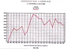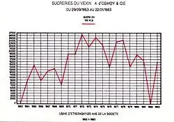 - 1969 : la cadence de l'usine est de 2 325 tonnes par jour. Il est travaillé 216 000 tonnes de betteraves et produit 28 800 tonnes de sucre, 22 000 hectolitres d'alcool et 80 tonnes de levure alimentaire. La fin des années 1960 voit le progrès de la régulation. Les régulateurs ARCA ont fait leurs preuves depuis de nombreuses années à l'évaporation, c'est maintenant à d'autres ateliers de voir apparaître d'autres types de régulation, souvent pneumatiques. Puis, aux turbines automatiques succède dans le domaine l'automaticité, la conduite de la cuite 1er jet et la mesure de conductibilité réglant l'introduction continue de sirop et maintenant une sursaturation donnée.