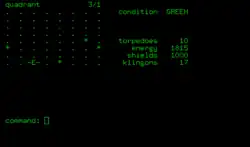 Star Trek est un jeu vidéo de stratégie en mode texte inspiré de la série télévisée Star Trek et initialement développé par Mike Mayfield en 1971 sur ordinateur central. Le joueur est aux commandes du vaisseau spatial USS Enterprise et a pour mission de traquer et de détruire une flotte de vaisseaux Klingon dans un temps limité.