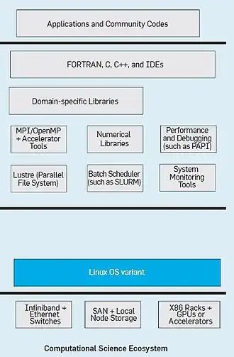 Dans les années 1980, la superinformatique vectorielle dominait l'informatique haute performance, comme en témoignent les systèmes nommés du même nom conçus par Seymour Cray. Les années 1990 ont vu la montée du traitement massivement parallèle (MPP : Massively Parallel Processing) et des multiprocesseurs à mémoire partagée (SMP : Shared Memory Multiprocessors) construits par Thinking Machines Corporation, Silicon Graphics et d'autres. À leur tour, des grappes de produits (Intel / AMD x86) et de processeurs spécialement conçus (comme BlueGene d'IBM) ont dominé les années 2000. La décennie suivante, ces clusters sont complétés par des accélérateurs de calcul sous la forme de coprocesseurs d'Intel et d'unités de traitement graphique (GPU) de Nvidia ; ils comprennent également des interconnexions à haut débit et à faible latence (comme Infiniband). Les réseaux de stockage (SAN) sont utilisés pour le stockage de données persistantes, avec des disques locaux sur chaque nœud utilisé uniquement pour les fichiers temporaires. Cet écosystème matériel est optimisé en priorité pour les performances, plutôt que pour un coût minimal. Au sommet du matériel du cluster, Linux fournit des services systèmes, complétés par des systèmes de fichiers parallèles (tels que Luster) et des planificateurs de lots (tels que PBS et SLURM) pour la gestion des travaux parallèles. MPI et OpenMP sont utilisés pour le parallélisme entre nœuds et internœuds, optimisé de bibliothèques et d'outils (tels que CUDA et OpenCL) pour une utilisation en coprocesseur. Des bibliothèques numériques (telles que LAPACK et PETSc) et des bibliothèques spécifiques au domaine complètent la pile logicielle. Les applications sont généralement développées en FORTRAN, C ou C++[17].