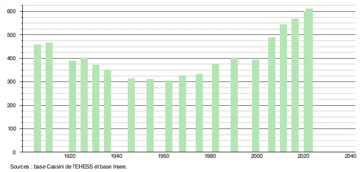 L'évolution du nombre d'habitants est connue à travers les recensements de la population effectués dans la commune depuis 1906. Pour les communes de moins de 10 000 habitants, une enquête de recensement portant sur toute la population est réalisée tous les cinq ans, les populations de référence des années intermédiaires étant quant à elles estimées par interpolation ou extrapolation[25]. Pour la commune, le premier recensement exhaustif entrant dans le cadre du nouveau dispositif a été réalisé en 2006[26].