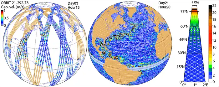 - SWOT doit déboucher, grâce à sa résolution élevée, sur une meilleure connaissance de la circulation océanique de type méso-échelle et (sub) méso-échelle. Compte tenu du rôle joué par celle-ci dans le transport d'énergie, la mission permet d'améliorer les modèles climatiques. SWOT doit permettre également d'évaluer les effets de la circulation des eaux côtières sur la vie marine, les écosystèmes et la qualité de l'eau.