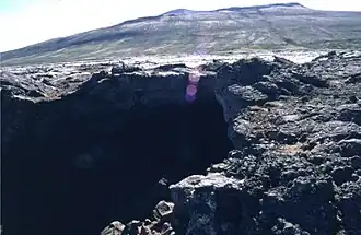 Vue de l'entrée de la Surtshellir dans le Hallmundarhraun avec au dernier plan Strútur.