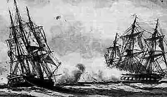 Combat entre la frégate française La Surveillante et la frégate britannique HMS Quebec, 6 octobre 1779. Auguste-Louis de Rossel. | |