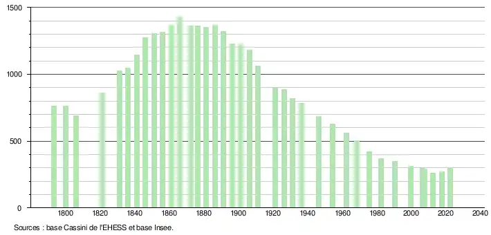 L'évolution du nombre d'habitants est connue à travers les recensements de la population effectués dans la commune depuis 1793. Pour les communes de moins de 10 000 habitants, une enquête de recensement portant sur toute la population est réalisée tous les cinq ans, les populations de référence des années intermédiaires étant quant à elles estimées par interpolation ou extrapolation[18]. Pour la commune, le premier recensement exhaustif entrant dans le cadre du nouveau dispositif a été réalisé en 2007[19].