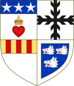 Ecartelé : au 1er d'argent, au coeur de gueules couronné d'or, au chef d'azur à trois étoiles du premier (de Douglas) ; au 2 : d'argent à la écotée de sable, au 3 d'argent à un chef d'or à trois pals de gueules; au 4ème d'azur à trois têtes de sanglier d'argent, à la bordure du même. |