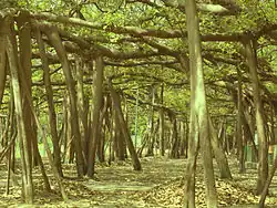 Le figuier indien, Ficus bengalensis, dont les branches s'enracinent comme de nouveaux arbres sur une grande surface. Les racines donnent ensuite naissance à d'autres troncs et branches. En raison de cette caractéristique et de sa longévité, cet arbre est considéré comme immortel et fait partie intégrante des mythes et légendes de l'Inde. Aujourd'hui encore, le banian de l'Inde est le point central de la vie du village et le conseil du village se réunit à l'ombre de cet arbre[7].
