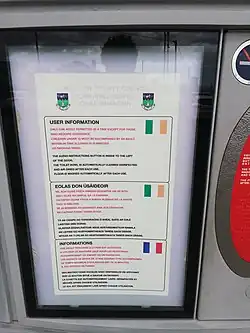 Panneau en Irlande avec neuf langues représentées par leurs drapeaux et leurs noms.