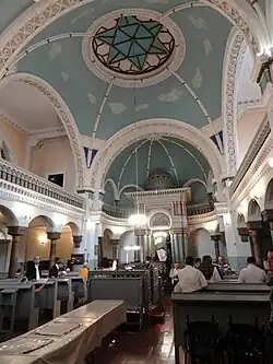 La salle de prière est construite sur un plan basilical, formée d'une nef centrale et de deux bas-côtés situés en dessous de la galerie des femmes. À l'extrémité de la nef, et séparée de celle-ci par une arche plein cintre, se trouve une abside surmontée d'une voûte en cul-de-four nervurée et peinte en bleu clair. Le plafond de la nef est composé de deux coupoles peintes en bleu-ciel avec des nuages en blanc, percées à leur sommet d'un grand oculus avec une étoile de David de couleur bleue.